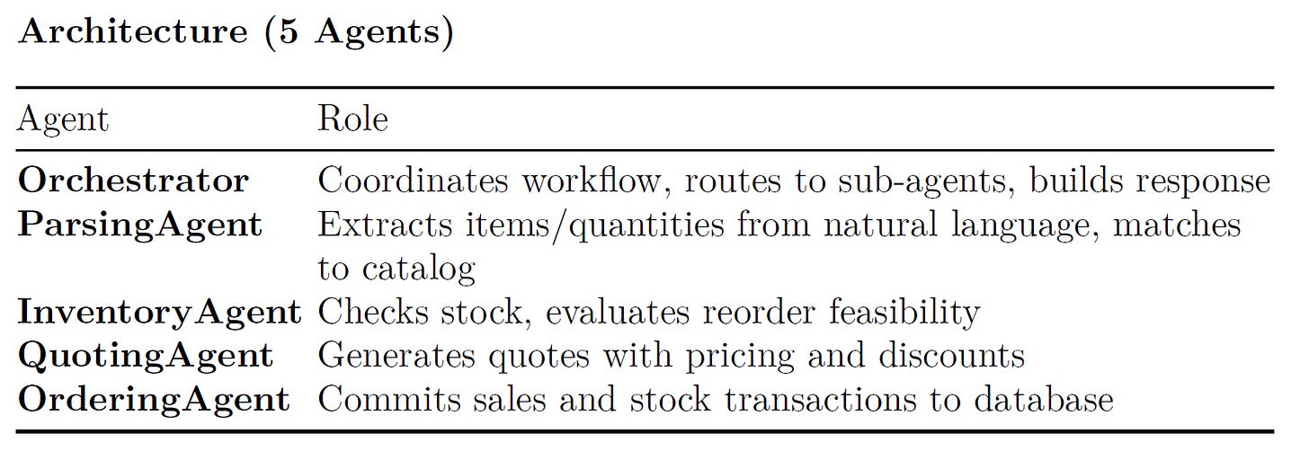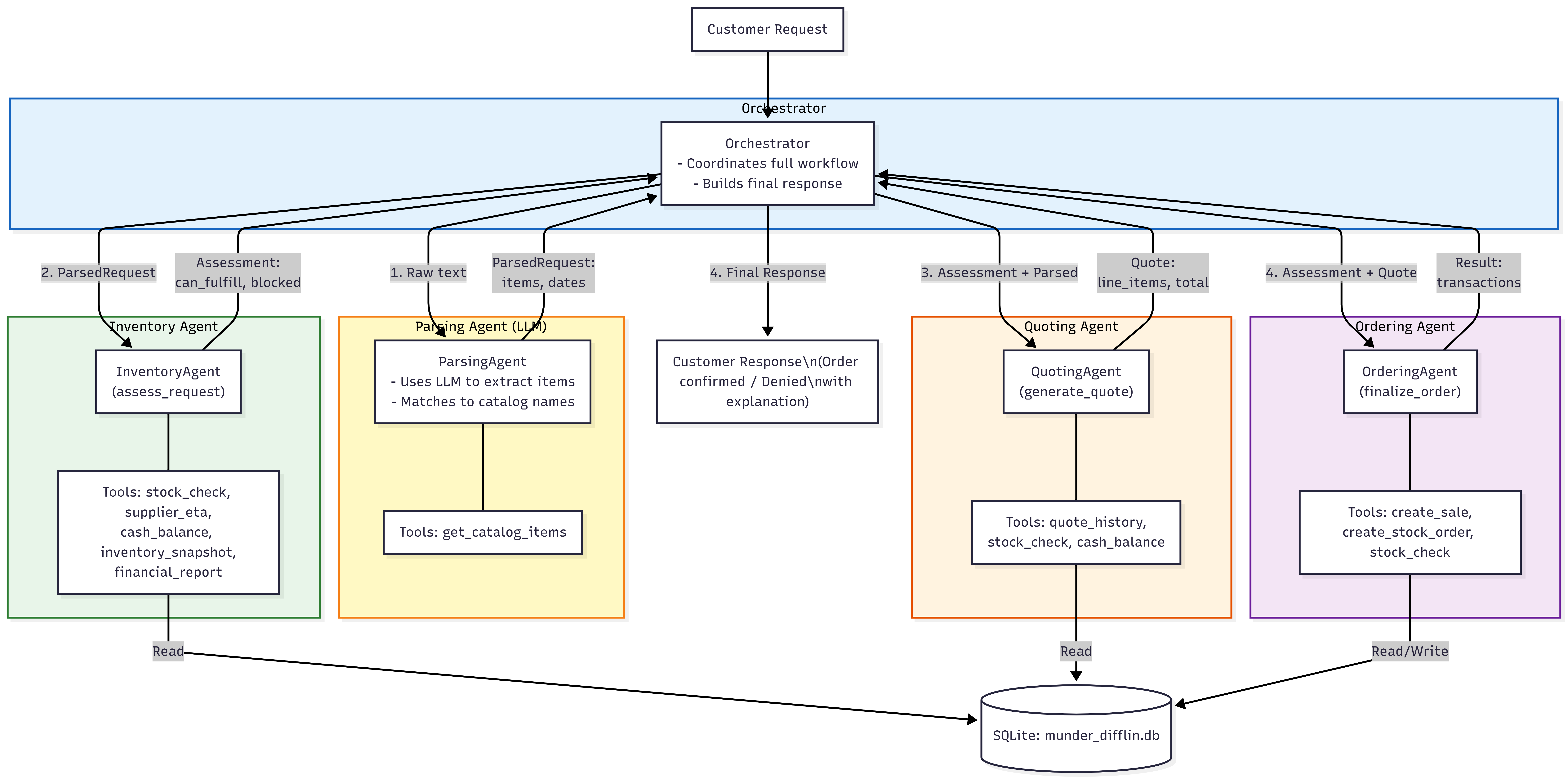 The multi-agent system provides the ability to quote for paper supplies and to automatically process orders through the orchestrator agent.
