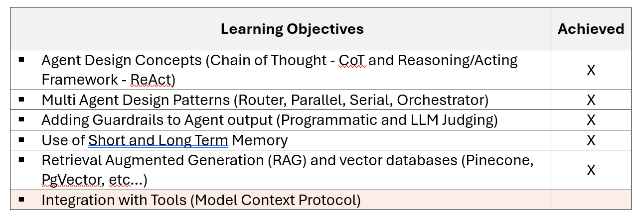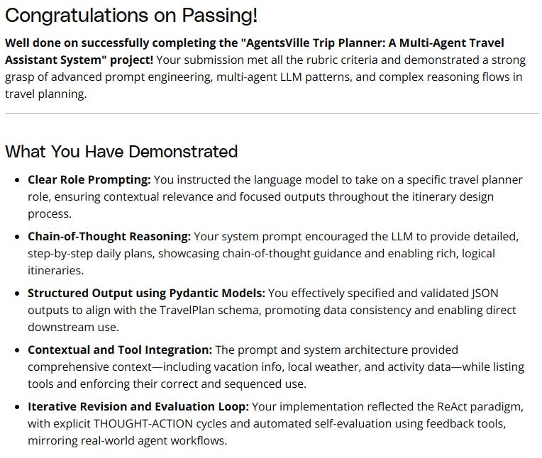 I started with course #3 as part of the Udacity Agentic AI course. This course goes deeper into using tools, formatting structured output, interacting with databases, using RAG and adding short and long term memory support. I’m about 60% done with the nanodegree.
