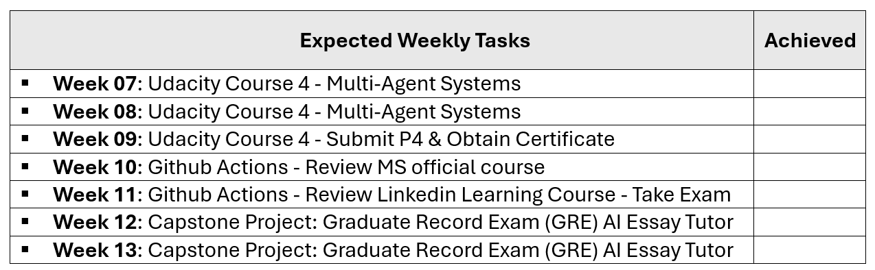 [ ] Week 12: Capstone Project: Graduate Record Exam (GRE) AI Essay Tutor