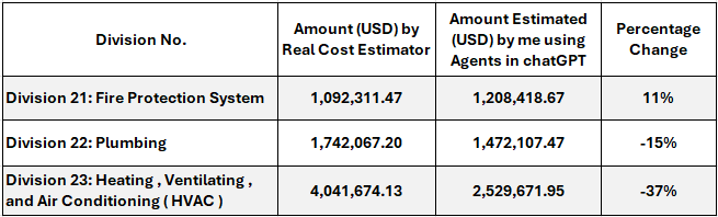 Last week was focused on narrowing my topic of interest and since I’m on a trajectory to develop my AI skills, I went for Agentic AI. It’s a trendy topic and I’d love to gain a better understanding.I’ve been experimenting with construction cost estimations on several projects using line item descriptions and a basic knowledgebase of two previously priced construction projects with chatGPT in Thinking mode (i.e. using agents) but with mixed results. Here’s a sample of a project that was recently estimated using AI agents vs a real cost estimator for mechanical works in a 5 stars hotel: